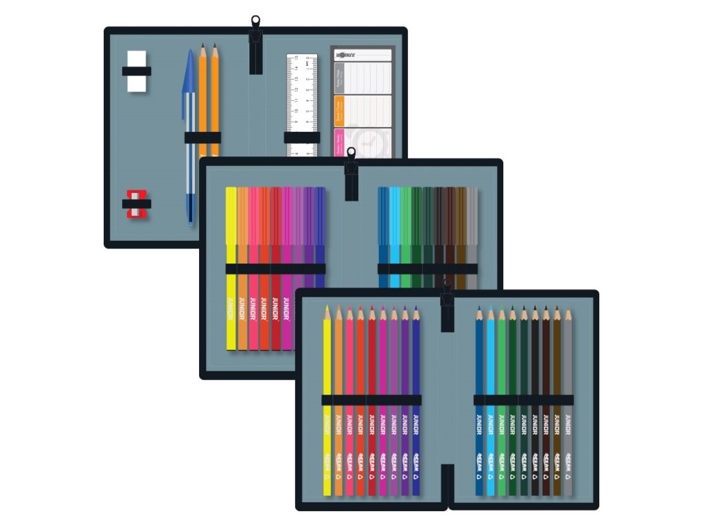 Naplnený, 3-poschodový peračník JUNIOR s rozvrhom hodín.