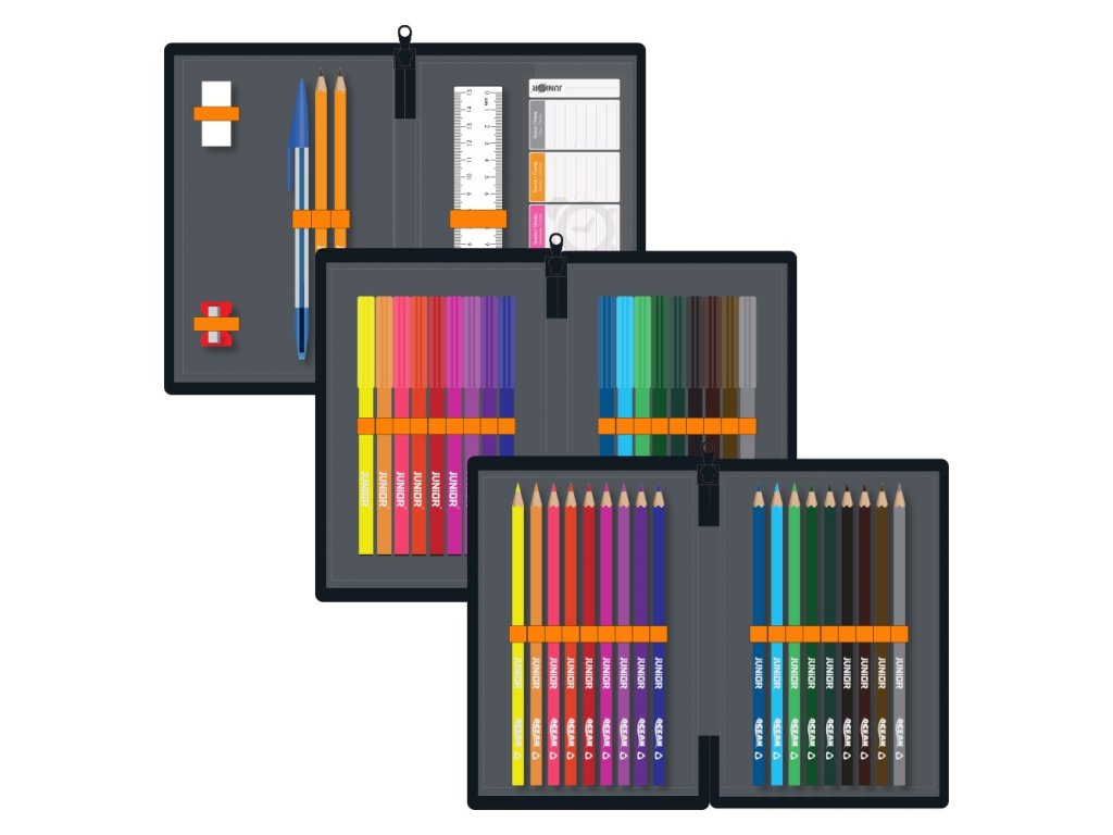 Naplnený, 3-poschodový peračník JUNIOR s rozvrhom hodín.
