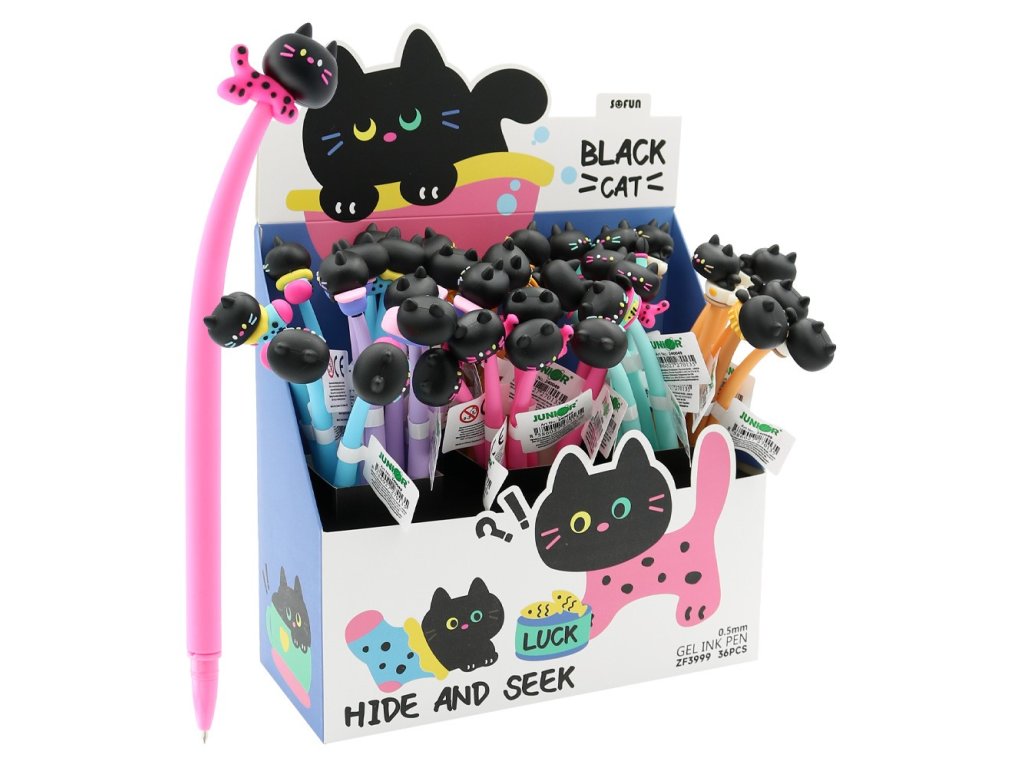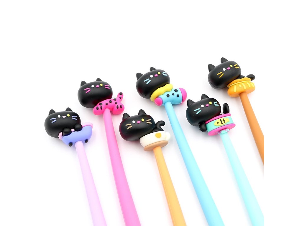 Dlhé gélové pero s gumenou figúrkou mačky na vrchnom, ohybnom konci (3 farby /6 dizajnov).