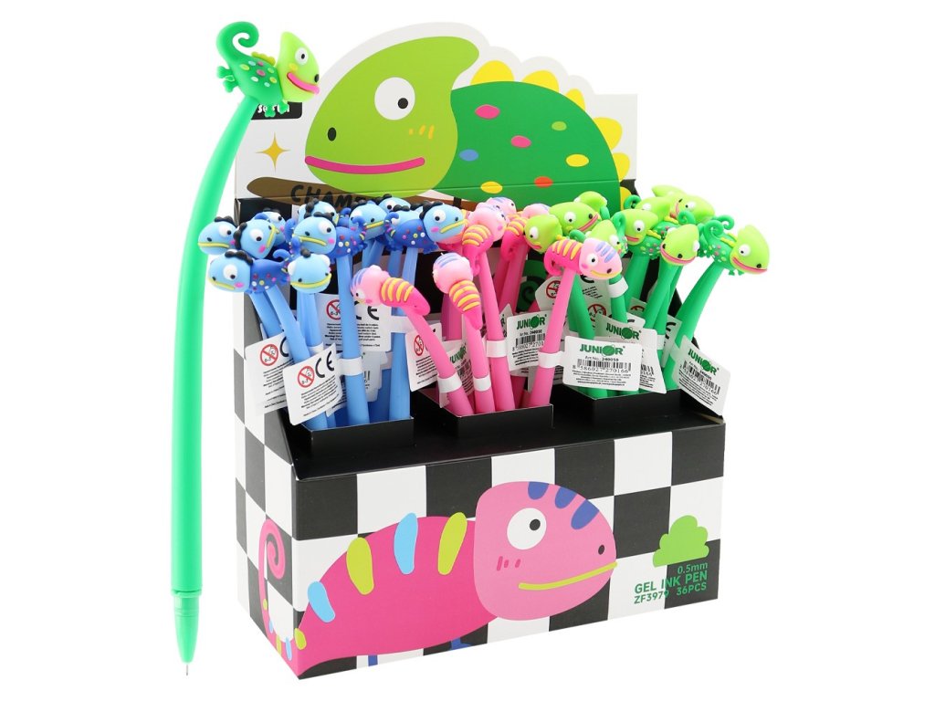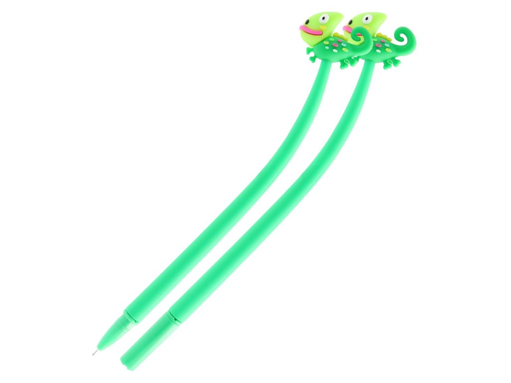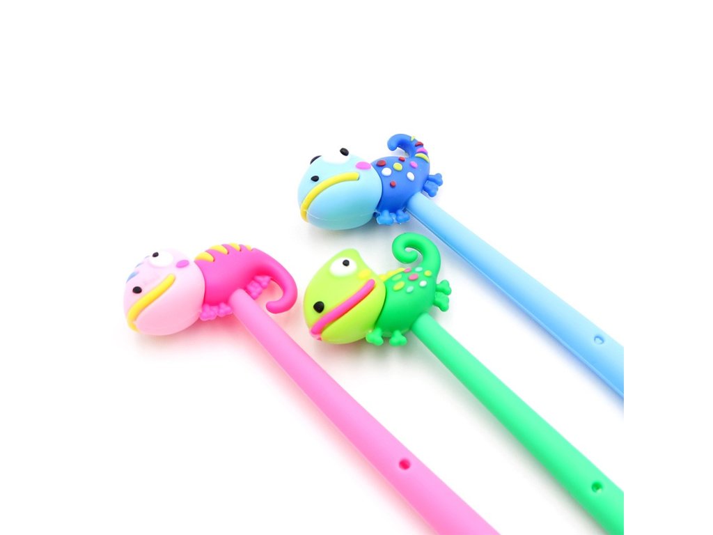 Dlhé gélové pero s gumenou figúrkou chameleóna na vrchnom, ohybnom konci (3 farby /3 dizajny).