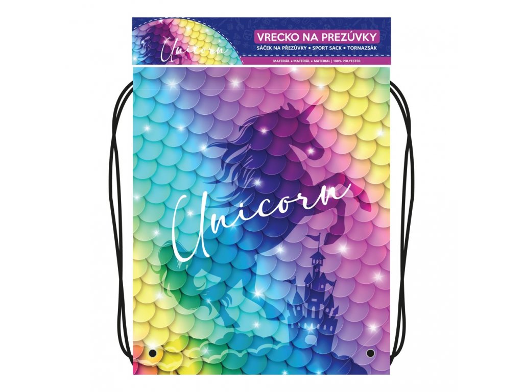Textilné vrecko na prezuvky s farebnou potlačou na prednej strane, so zarážkami na zaťahovanie na oboch stranách. Materiál: Polyester. Rozmer: 40x32 cm.